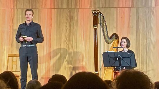 Heiko Ruprecht trägt beim Kulturring-Abend in der Eduard-Mörike-Mehrzweckhalle schaurig-schöne Abenteuergeschichten in Versform vor – begleitet von Veronika Ponzer an der Harfe.