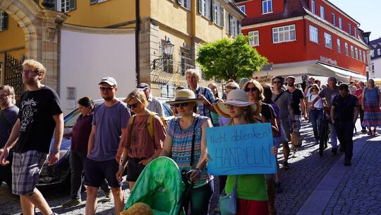 Nicole MohnRund 100 Menschen zeigen bei der Klimaschutzdemonstration in Nürtingen der Energiepolitik der Bundesregierung die Rote Karte. Jung und Alt fordern ein Umdenken in der Energiepolitik.
