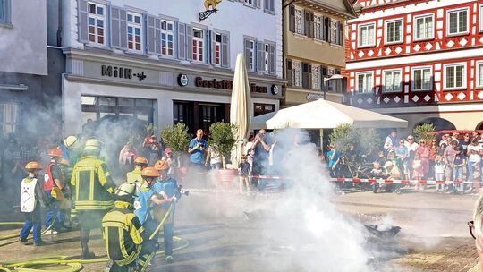 Spielerisch begann auch die Schauübung der Nachwuchsfeuerwehrleute im Alter von 6 bis 10 Jahren: Von Hand zogen sie ihren Löschwagen vom Marktplatz in die Marktstraße, und mit ihren Stimmen imitierten sie täuschend echt, aber deutlich weniger lautstark die entsprechenden Sirenenklänge. Wie bei einem echten Einsatz ging es dann zunächst darum, das Brandgebiet abzusichern und abzusperren, bevor die Rohre angeschlossen und die Schläuche ausgerollt werden konnten. An Westen mit unterschiedlichen Farben erkennbar, waren die Kinder in drei verschiedene Trupps eingeteilt: den Wassertrupp, den Schlauchtrupp und den Angriffstrupp. Hinzu kamen Melder, Maschinisten und Gruppenführer.