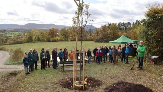 Der ausgewählte Standort bietet nicht nur einen weiten Blick über Jesingen und den Albtrauf, sondern auch eine Sitzbank, die künftig zum Verweilen im Schatten des Baumes einladen soll. Der Spierling (Sorbus domestica) gehört zur Familie der Rosengewächse, wächst langsam und kann mehrere Jahrhunderte alt werden.