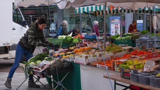 Auch an der „Allgäuer Käsehütte“ steht inzwischen der erste Kunde. Martina Bischof begrüßt ihn mit einem kurzen Lächeln, die beiden kennen sich seit Jahren. Während sie ein Stück Käse abschneidet, redet sie über Sorten und Reifezeiten. In der Theke liegen große Räder aus dem Allgäu, daneben Ziegenkäse, Feigenkäse, Sorten mit Steinpilz oder Kürbis, alles passend zur Jahreszeit. Bischof legt Wert darauf, dass ihre Auslage nicht nur vollständig, sondern auch einladend ist. „Andere bieten ja auch saisonal andere Sachen an. Mir ist wichtig, dass wir da ebenfalls Abwechslung reinbringen“, sagt sie und steckt ein neues Schild in die Theke. Seit Jahrzehnten beginnt ihr Tag früh. „Ich stehe immer um vier auf“, sagt sie. „Ich bin Frühaufsteherin und ich seh einfach gern die Sonne aufgehen.“