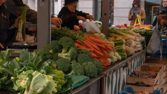 Über den Platz hinweg mischen sich jetzt die Stimmen. Zwischen den Ständen riecht es nach Brot und Käse, vom Regen sind nur noch Pfützen übrig. Das metallische Rattern der Rollwagen wird seltener, ersetzt vom Stimmengewirr der Kundschaft. Menschen beugen sich über die Auslagen, Tüten rascheln, Stimmen überlagern das Klirren. Zwischen den Ständen ist jetzt ständig Bewegung.