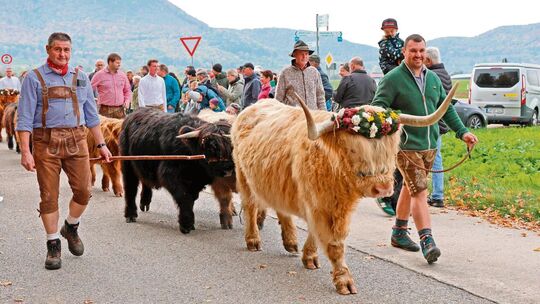 Kirchheim. Für die Beteiligten war das trockene Herbstwetter am Sonntag ein Segen, denn sie konnten trockenen Fußes den mittlerweile schon traditionellen Albabtrieb in Nabern absolvieren. Auch die mehreren hundert Besucherinnen und Besucher an den Wegen rund um die Scheune von Daniel und Stefanie Devaux genossen das Wetter und feierten die Rückkehr der Tiere ins Tal. Mittlerweile hat der Umzug zum 14. Mal stattgefunden.