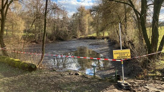 Der Kirchheimer Sonnensee ist derzeit weitgehend abgelassen. Auf den freiliegenden Bereichen befindet sich stellenweise hüfttiefer, stark saugender Schlamm. Wer diese Bereiche betritt, riskiert einzusinken. Die Stadt Kirchheim bittet alle Personen vor Ort, die Schlammflächen nicht zu betreten und die Absperrungen unbedingt zu beachten. Sie sollen verhindern, dass es zu Unfällen kommt. Das Ablassen dient dazu, den Nährstoffgehalt im See zu reduzieren und die ökologische Qualität des Gewässers zu verbessern.