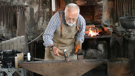 Mit Geschick und Muskelkraft fertigten die Schmiede damals Kessel, Rohre, Kannen und Töpfe. Dabei mussten sie darauf achten, dass das Material nur so lange mit dem Hammer bearbeitet wurde, wie es glühte. „Denn sonst wird das Material porös“, weiß Hobbyschmied Hans-Jürgen Weller aus Zell unter Aichelberg, während er einen Stahl-Stab bearbeitet. Ihm konnte man in der Kupferschmiede beim Arbeiten zuschauen. Dort gab es dann auch viel Wissen mit auf den Weg. So etwa, dass Kupfer eine hervorragende Leitfähigkeit und darüber hinaus noch antibakterielle Eigenschaften aufweist – und wie die Maschinen über Lederbänder einst angetrieben wurden.