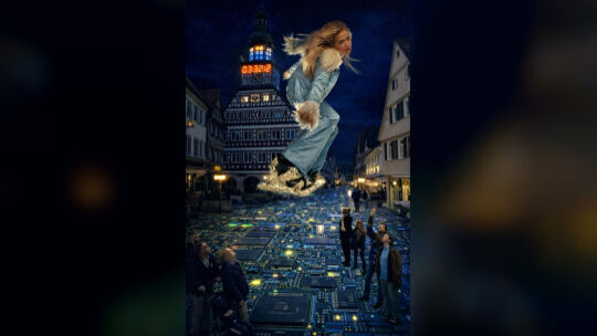 Heute fliegen zwar keine jungen Menschen auf Surfbrettern durch die Fußgängerzone, aber Künstliche Intelligenz hätte der Tick-Redaktion viel Arbeit abgenommen, wenn es sie schon gegeben hätte. Die rechte Aufnahme zeigt, was die KI – gefüttert mit dem Rathausbild und dem Foto der Surferin – aus der Idee macht. Und zwar in zwei Minuten.