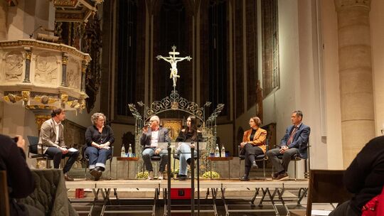 Um verschiedenen Perspektiven eine Stimme zu geben, hatte man ein vielfältiges Aufgebot an Gästen einbestellt: Vor dem Altar der prallgefüllten Kirche saß der Pädagoge Prof. Dr. Albrecht Wacker, die Vorsitzende des Gesamtelternbeirats Stefanie Rau, der ehemalige Schulleiter und Spiegel-Bestseller-Autor Stefan Ruppaner, die Schülerin Serena von der Freihof-Realschule und die Staatssekretärin des Kultusministeriums Sandra Boser. Sie vertrat Kultusministerin Theresa Schopper, die sich aus gesundheitlichen Gründen entschuldigen ließ. Die Rolle des Moderators übernahm der Schulleiter der Freihof-Realschule Marlon Lamour.