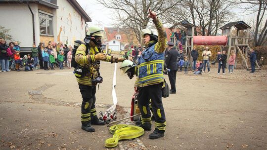 Die Feuerwehr Holzmaden probt den Ernstfall an Grundschule