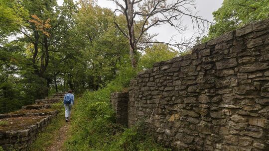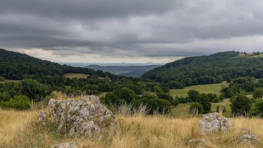 Start und Zielpunkt der Tour auf der Schwäbischen Alb ist der Wanderparkplatz Breitenstein. Eine Übersichtskarte zeigt dort alle folgenden Stationen. Einen kurzen Fußmarsch entfernt, kann man gleich zu Beginn den eindrucksvollen Panoramablick vom Felsplateau auf 811 Metern Höhe übers Tal und die gegenüber liegende Burg Teck genießen. Oder man wartet bis zum Ende der Tour auf und kehrt bestenfalls zum Sonnenuntergang zum Breitenstein zurück. Dank einer Tafel mit Ortsangaben und Kilometerentfernungen erfährt man auf dem Plateau zudem mehr über die Umgebung.