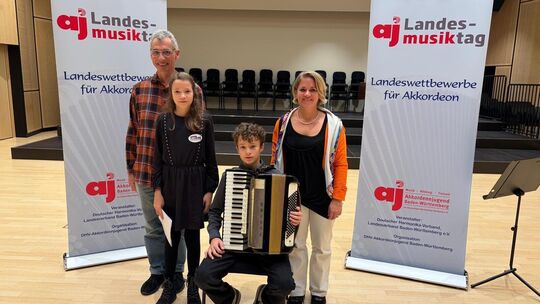 Rund 80 Kinder im Alter zwischen sechs und 17 Jahren traten in verschiedenen Altersklassen und unterschiedlichen Kategorien vor einer fachkundigen Jury und einem interessierten Publikum an. Tilo Reimann aus Bissingen (zweiter von rechts) nahm zum dritten Mal in der Kategorie „Akkordeon Solo Standardbass“ am Wettbewerb teil. Der 13-Jährige eröffnete mit dem rhythmischen lateinamerikanischen Stück „Arpeggios Latinos“, gefolgt von der gefühlvollen und dynamischen „Aria con variazione“ und dem schnellen, technisch anspruchsvollen Stück „Vreme Leti“. Als einer der jüngsten der Altersgruppe erspielte sich Tilo den dritten Platz mit der Wertung „hervorragend“. Gemeinsam mit seiner zwölfjährigen Schwester Annika Reimann (zweite von links) ging es kurz darauf zu einem weiteren Auftritt in der Kategorie „Kammermusik“. Die beiden präsentierten „Acoustic Flirt“, eine dreiteilige Suite für Akkordeon und Klavier. Dass die beiden die Herausforderung des Zusammenspiels bravourös meisterten, belohnte die Jury mit der Höchstwertung „hervorragend“, verbunden mit dem zweiten Platz. Der ereignisreiche Tag endete mit einem Konzert des Akkordeon-Landesjugendorchesters Baden-Württemberg. Bei der anschließenden Preisverleihung durften die beiden neben ihren Urkunden drei Medaillen und Pokale mit nach Hause nehmen. Mit ihnen freuten sich ihre beiden Lehrer Claudia Petrow (Akkordeon) und Bertram Schattel (Klavier). pm