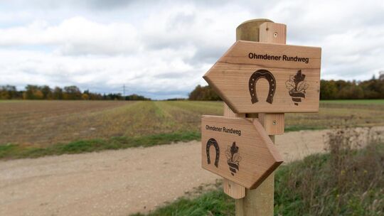 Auf das alte Sparbuch hatten Ohmdener Gemeinderäte ihre Sitzungsgelder eingezahlt, um später mit dem Angesparten gemeinsam einen Ausflug oder eine Reise zu unternehmen. Doch irgendwann ging das Sparbuch vergessen – obwohl noch einiges Geld darauf war. Eines Tages sagte der Kämmerer zur Bürgermeisterin: „Da ist noch ein Sparbuch da.“ Damit finanzierte die Gemeinde eine neue Linde, die hoffentlich zur Nachfolgerin des abgängigen Naturdenkmals Königslinde heranwachsen wird, dazu eine Ruhebank und eine Himmelsliege. Danach war noch immer Geld da, und das reichte nun für die drei großen Tafeln zum neuen Rundweg. Jede steht an einem anderen Parkplatz, so dass der Einstieg in den Rundweg für den Autofahrer an drei verschiedenen Stellen möglich ist.