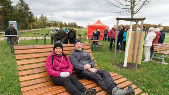 Mit über 100 Teilnehmern waren die Menschen in der Überzahl, doch rund ein Dutzend Hunde waren ebenfalls dabei, um den neuen Rundweg um Ohmden zu beschnuppern. Zuerst gab es beim Naturdenkmal Königslinde ein Ständerling mit Roten im Weggle, dort ist auch eine der drei neuen Schautafeln aufgestellt. Dann machten sich die Wanderer im Uhrzeigersinn auf den Weg über die neun Kilometer lange Strecke. Auf halber Strecke, bei der kurzen Durchquerung von Ohmden, gab es Kaffee und leckeren Kuchen.