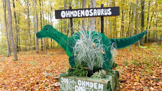 Ein Teilnehmer der Einweihung wird bald umziehen: Es ist der hölzerne Ohmdenosaurus, der für das Ereignis extra im Wald platziert wurde. Sein endgültiger Platz, unter einer schützenden Plexiglashaube und mit Beschriftung, wird auf einem Spielplatz sein.