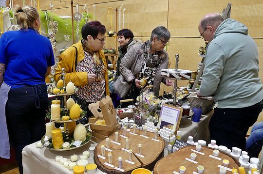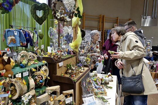 Einige Meter entfernt bietet Andreas Jänicke zuckersüße Babyschühchen aus Wolle an: Ein Mann der häkelt? Nein, vielmehr hält er seiner Frau Regina den Rücken frei. „Mir macht das mehr Spaß, als den Stand auf- und abzubauen“, verrät der kommunikative Gerlinger, der in seiner frischen Art bestimmt den Umsatz nach oben schraubt. Mittlerweile sind die Materialien ebenso facettenreich wie das Angebot der Dinge. So gibt es Polaris-Schmuck, der aus hochwertigem Kunststoff kreiert wird, Häschen und Hasen aus Holz, Stoff und Wolle sowie Basteleien aus Filz, Papier und mit Findlingen direkt aus der Natur – nützliche oder dekorative Mitbringsel, bei der nicht zuletzt auch die Geschenkejäger voll auf ihre Kosten kommen. Gut angenommen werden obendrein die Auszeiten bei Kaffee und Kuchen oder Pommes und Maultaschen.