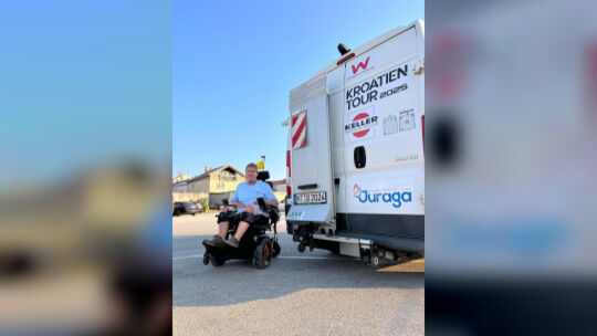 Elf Tage war der 64-Jährige mit seinem E-Rollstuhl unterwegs. Von Jesingen aus legte er mehr als 1000 Kilometer zurück bis er Murter erreichte. Begleitet wurde er von seiner Familie, von Freunden, und sogar sein Azubi sprang kurzfristig ein. Im Transporter hatten sie Ersatzteile, Akkus und einen zweiten Rollstuhl dabei. „Ohne mein Begleiterteam wäre das alles gar nicht möglich gewesen“ betont Baur. Die Strecke führt über Deutschland, Österreich, Italien und Slowenien bis an die Adria. Die Tour war gut vorbereitet: Hotels gebucht, Etappen geplant, Pausen und Akkuwechsel fest eingeplant, aber unterwegs zeigte sich, dass Flexibilität wichtiger war als jede Karte. 80 bis 90 Kilometer am Tag hat der Jesinger zurückgelegt. „Ich sitze ja sonst auch viel, deswegen war das für mich kein Problem.“