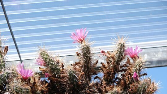 Dass man Kakteen nicht zu pflegen braucht, ist ein Irrtum. Gar nicht so einfach, sie zum Blühen zu bringen. Aber wenn sie es dann tun, ist die Freude groß. Zur Hauptblütezeit im Frühjahr wird es bunt in Heinz Barz’ 30 Quadratmeter großem, selbst gebautem Gewächshaus. Sein Hauptsammelgebiet, die Gattung Echonocereus pectinatus, präsentiert sich dann mit weißen, gelben, rosa oder roten Blüten – „eigentlich alle Farben außer Blau und Schwarz“. Aber auch jetzt im Sommer kann man einzelne Kakteen mit Blüten entdecken.