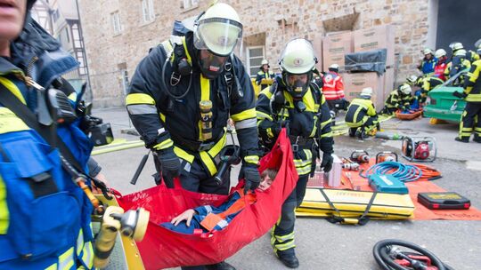 Mit 60 Einsatzkräften und zehn Fahrzeugen rückte die Freiwillige Feuerwehr Kirchheim am Samstag zu ihrer Hauptübung am Kornhaus aus. Als Erstes waren der Zugführer, erkennbar an der grünen Kleidung, und der Einsatzleiter in Gelb vor Ort, um sich ein Bild der Lage zu machen.