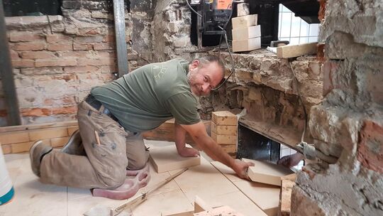 Währenddessen erklärt der Handwerker die besonderen Eigenschaften des Schamottsteins und dessen Herstellung: „Für den Stein wird frischer Ton mit bereits gebranntem, erneut gemahlenem Ton vermengt, dann in Form gebracht, getrocknet und gebrannt. Es ist quasi ein Doppelbrand, wodurch der Stein seine besondere Eigenschaft erhält – ihm macht Hitze und schnelle Abkühlung nichts aus.“ Doch selbst an so einem robusten Kunststein nagt der Zahn der Zeit, dann schlägt die Stunde von Daniel Reisinger.