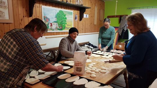 Die ofenwarmen Dätscher wurden in geselliger Runde schnell verspeist. Vorbereitet hat sie Trudi Graf mit ihren Helferinnen und Helfern. Egal ob mit Speck, Kümmel, Schnittlauch oder gemischt belegt konnte sich jede und jeder seinen Lieblingsdätscher vom Blech holen. Mit Fachsimpeln und Gesprächen wurde die Zeit überbrückt, bis der Ofen die abgekühlte Temperatur erreicht hatte, um den Teig fürs eingenetzte Brot einzuschießen. ih
