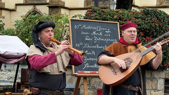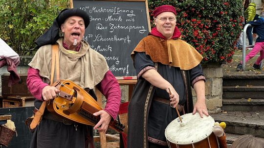 Am Brunnen spielt das Duo „Zeitensprung“. Sie bringen historische Instrumente mit, schlagen Trommeln und greifen zu Flöten, die ihren Gesang begleiten. Ein Junge im Ritterkostüm mit Helm tanzt mit, während sich Kinder und Erwachsene im Kreis um die Musiker versammeln. Sie klatschen im Takt und lachen. In ihren Liedern singen sie von Marktszenen: beispielsweise den Streit darum, ob der Vater auf dem Markt am Sonntag für zwei Groschen ein Mäuschen oder ein Kätzchen kauft. Hinter der Menschentraube steigen große Seifenblasen auf, die Kinder mit ausgestreckten Händen verfolgen.