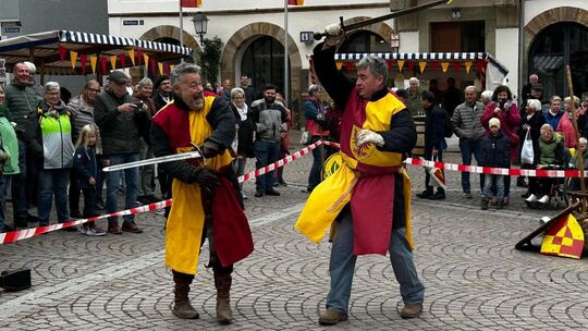 Die Schwerter prallen aufeinander und das Klirren hallt über den Platz vor dem Weilheimer Rathaus. Die „Teckschen Trutzn“ treten in wechselnden Formationen gegeneinander an: mal mit Schwert und Schild, mal mit langen Stöcken oder gleich mit zwei Klingen. Am Rand stehen Kinder mit Helmen und Holzschilden dicht hinter dem Absperrband. „Alle Kinder, die mit Nase gekommen sind, gehen auch wieder mit Nase“, ruft der Ansager. Nach jeder Runde schlagen die Kämpfer mit den Kindern ab, bevor zum Schluss Goldtaler aus Schokolade in die Menge fliegen und ein wildes Rennen auslösen.